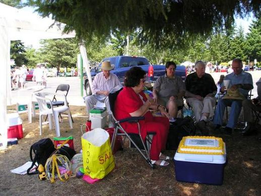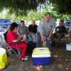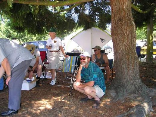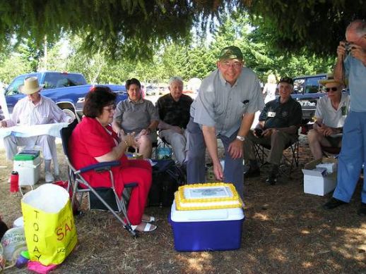 Our esteemed President, Wayne Beyer, cutting the Rover Birthday Cake, (in red - Sylvia Miller, brown Club shirt - Suzanne Miller, Peter Miller, Wayne [standing], Ian Potts [seated], Neil Webb [seated], Peter Heaster [snapping photo])